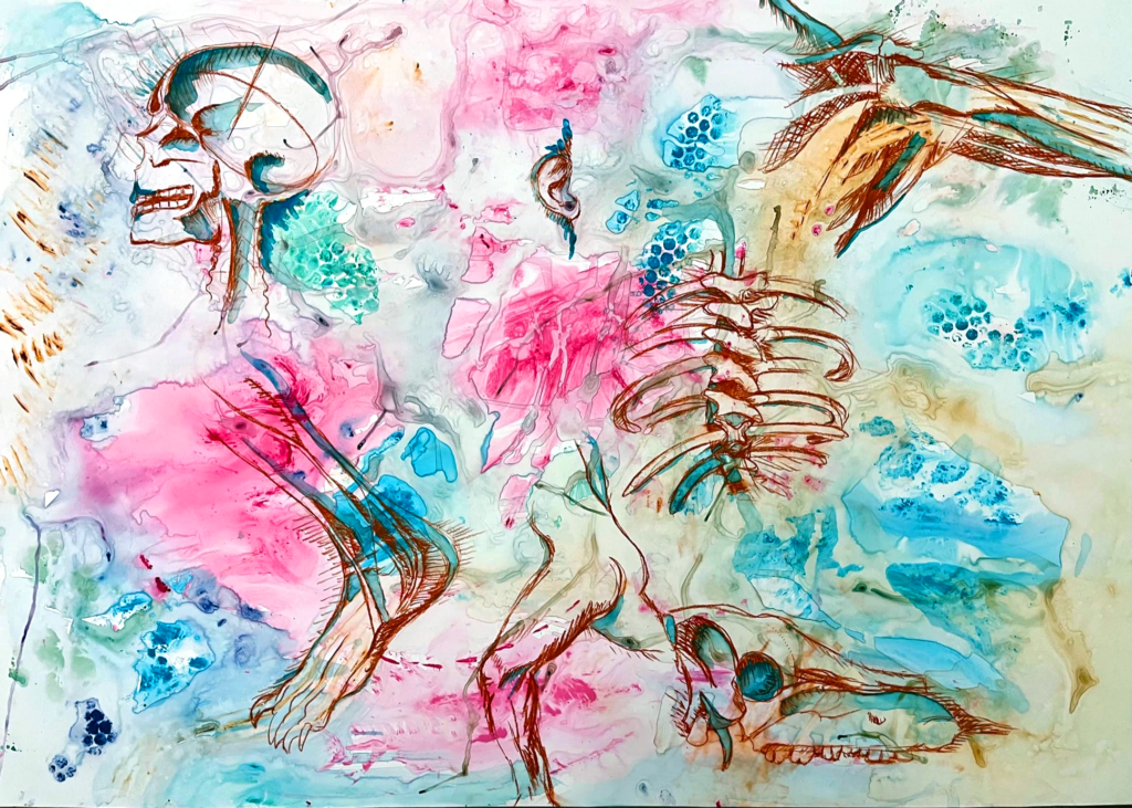 Dit werk is een vrije interpretatie van anatomische studies, geïnspireerd door de meesterlijke tekeningen van Leonardo da Vinci. Met vloeiende lijnen en transparante lagen in aquarel en inkt, verken ik de structuur van het menselijk en dierlijk lichaam. De kleuren – een samenspel van zachte blauwen, levendig roze en aardse tinten – geven het geheel een bijna dromerige, organische sfeer.